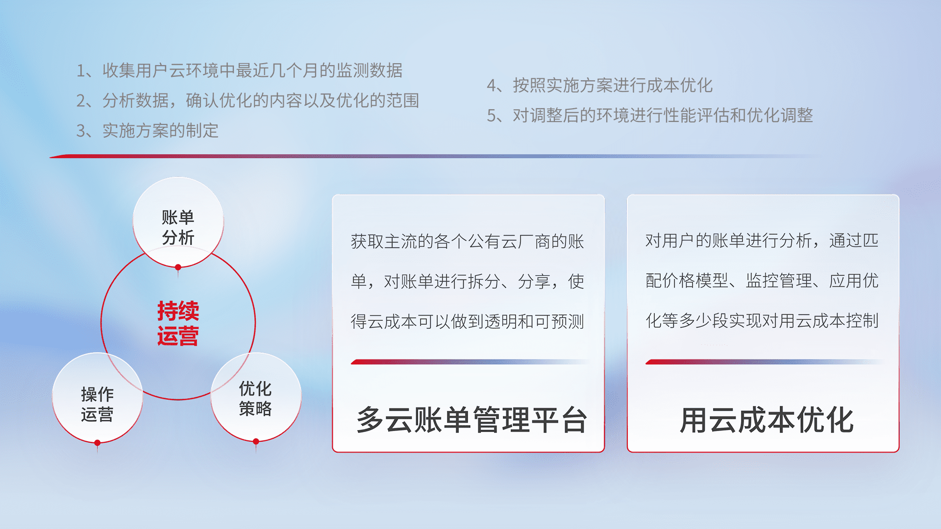 通过多云纳管,,以统一的资源数据模型把客户的云资源进行抽象和封装,,,进而实现对多云资源的统一操作,,,保障云资源管理的可靠性、、稳定性与可用性。。量身定制化运维内容,,,,配置、、开发运维、、、、补丁管理、、、、备份、、、、监控、、认证和访问管理、、、、审计和日常巡检等,,,,保障在用云过程中的可靠度,,稳定度以及高可用率。。